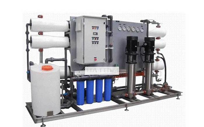 原水(設(shè)有壓力保護(hù))→增壓泵(一用一備)→砂過濾器→炭過濾器→硬化器(根據(jù)地區(qū)不合選用)→緊密過濾器(或稱保安過濾器)→兩頭水箱→RO前水泵→緊密過濾器(或稱保安過濾器)→RO高壓泵→RO反滲透零碎→RO水箱→RO水增壓泵→混床→終端緊密過濾→設(shè)備用水(水質(zhì)可以達(dá)到16MΩ.cm以上即0.06 μs/ ㎝以下,25 ℃)