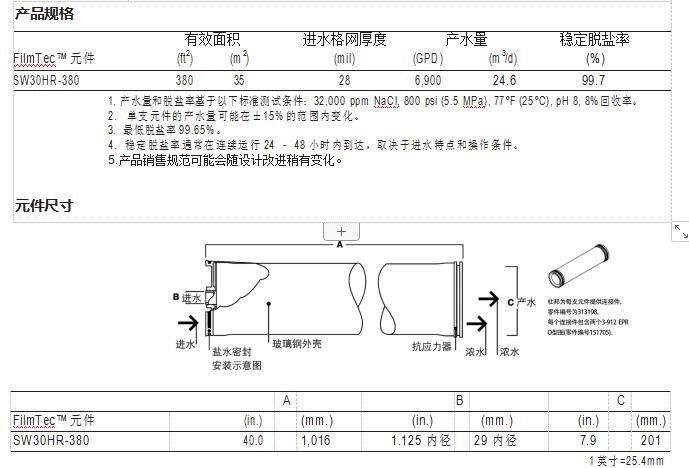 FilmTec™ SW30HR-380 元件是一款優(yōu)質的海水淡化反滲透膜元件,它的有效膜面 積高、脫鹽率高,能為海水淡化系統(tǒng)帶來長期的最佳經(jīng)濟性。