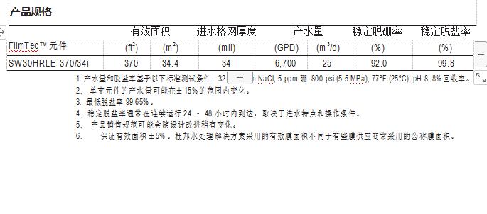 FilmTec™ SW30HRLE-370/34i 元件是一款高耐久性、高脫除率、高產(chǎn)水量海水膜元 件,用于高污染或挑戰(zhàn)性水源的情況,有助于系統(tǒng)的穩(wěn)定運行和產(chǎn)水成本的降低。