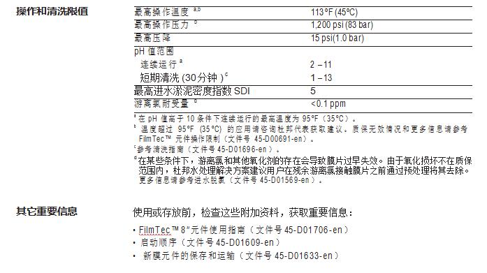 • 無需進行氧化后處理保證了在整個運行周期內(nèi)都能保持高性能。FilmTec™ 元 件更耐用,且能在更寬泛的 pH 值范圍(1-13)內(nèi)進行化學清洗。