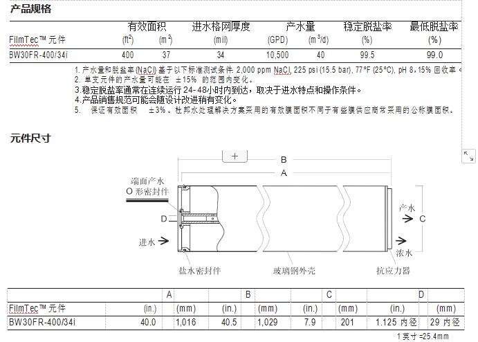 FilmTec™ BW30FR-400/34i 是一款適用于處理高污染水源、同時(shí) 具有抗污染性、高脫鹽率和高產(chǎn)水量的抗污染膜元件。