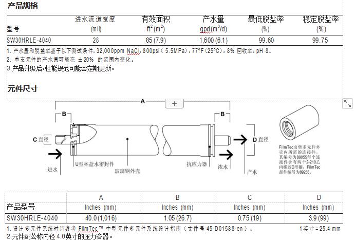 FilmTec™ SW30HRLE-4040 反滲透膜元件是 SW30HRLE-400 膜元件對(duì)應(yīng)的 4 英寸產(chǎn) 品。SW30HRLE-400 是業(yè)界領(lǐng)先的海水淡化膜元件,同時(shí)具有前所未有的高產(chǎn)水 率和脫鹽率,使得凈化高鹽度水的系統(tǒng)制水總成本最低。