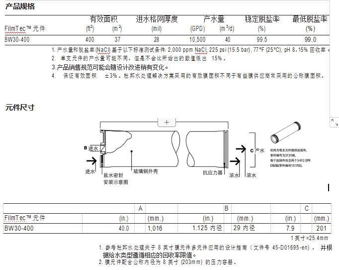 FilmTec™ BW30-400 在要求高品質(zhì)的產(chǎn)水時是很好的產(chǎn)品選擇。這是市場上第一 款 400 平方英尺的膜元件,繼續(xù)被廣泛用于新設(shè)備和舊系統(tǒng)改造,尤其系統(tǒng)資 金和生產(chǎn)力是考慮因素時。