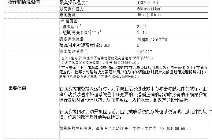 • FilmTec™ BW30-400 膜元件在生產(chǎn)過程中無預(yù)氯化處理,保證了高產(chǎn)水量和高 脫鹽率。這是為什么 FilmTec™ 元件相比其他品牌元件更耐用且可以在最寬的 pH 耐受范圍(1-13)進(jìn)行化學(xué)清洗的原因。