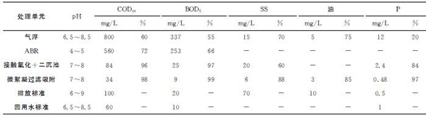 本工程采用氣浮-ABR-接觸氧化-過濾吸附組合工藝,取得良好的處理效果。由各處理單元出水2010年月平均值可知,本工藝的平均CODcr去除率為98%,SS去除率為88%,油去除率為85%,運行過程中主要處理單元的出水水質(zhì)見表3。