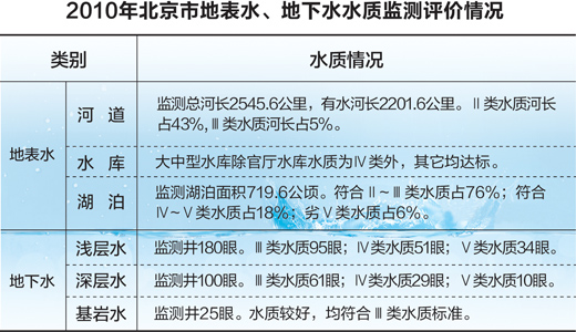 北京水資源主要包括:地下水、地表水、外調(diào)水、應(yīng)急水源。根據(jù)國家相關(guān)標準,水源地的水質(zhì)應(yīng)為Ⅰ、Ⅱ、Ⅲ類水。據(jù)了解,密云水庫是目前北京唯一的地表水源地;官廳水庫在1997年就因入庫水量銳減、水環(huán)境惡化而退出飲用水源地,只作為京西工業(yè)和景觀用水水源。