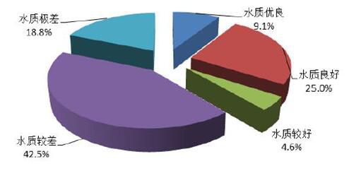 根據(jù)國(guó)家環(huán)保部發(fā)布的《2015中國(guó)環(huán)境狀況公報(bào)》,長(zhǎng)江、黃河、珠江、松花江、淮河、海河、遼河等七大流域和浙閩片河流、西北諸河和西南諸河的國(guó)控?cái)嗝嬷,Ⅰ~Ⅲ類、Ⅳ~(yú)Ⅴ類以及劣Ⅴ類水質(zhì)斷面比例分別為72.1%、19.0%和8.9%。