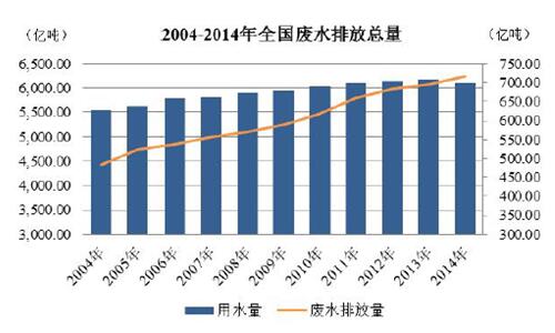 國(guó)家統(tǒng)計(jì)局?jǐn)?shù)據(jù)顯示,2004至2014年期間,全國(guó)的用水量由5,547.80億噸增至6,094.86億噸,增幅為9.86%,與此同時(shí),全國(guó)廢水排放總量由482.40億噸增至716.18億噸,增幅達(dá)到了48.46%。