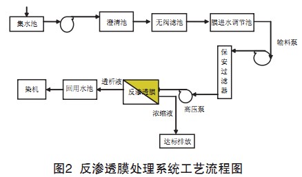 印染廢水經(jīng)過達標處理后,在保證膜系統(tǒng)穩(wěn)定運行 的前提下,綜合考慮投資和運作費用,經(jīng)多次試驗證 明,工程水回收率設計為50%比較為理想。反滲透膜處理 系統(tǒng)工藝流程見圖2。