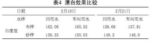 測試回用水及車間用水的漂白布樣及紗樣白度值見 表4。從表4中的數(shù)據(jù)可知,膜處理回用水漂白樣的白度 稍優(yōu)于車間用水漂白樣。