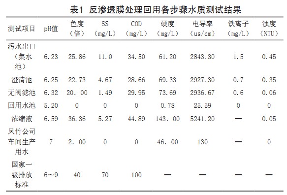 1.2.2 反滲透膜處理回用各步驟水質測試 連續(xù)一周取各步驟水樣測試水質,測試結果的平均值見表1。