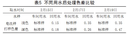 以車間生產(chǎn)用水的后處理樣為標準樣,測試回用水 后處理樣的色差見表5。