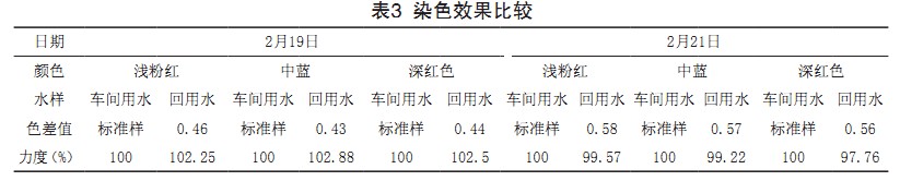 以車間用水染色樣為標準樣,測試回用水染 色樣力度及色差值見表3。