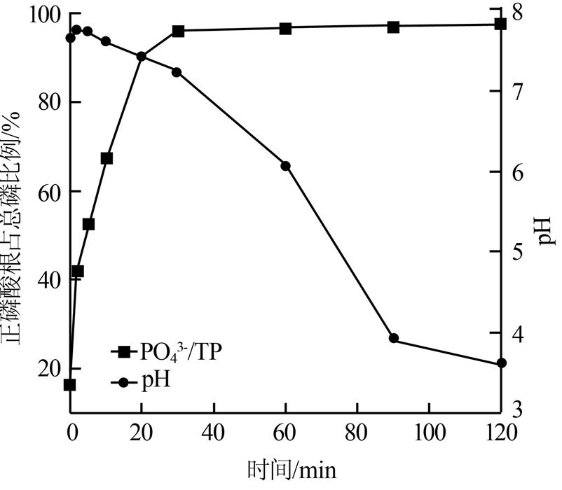 實驗水質(zhì)同2.2,考察臭氧投加質(zhì)量濃度為96 mg/L時,廢水中正磷酸鹽占總磷比例和pH隨時間的變化趨勢,結(jié)果如圖 3所示。