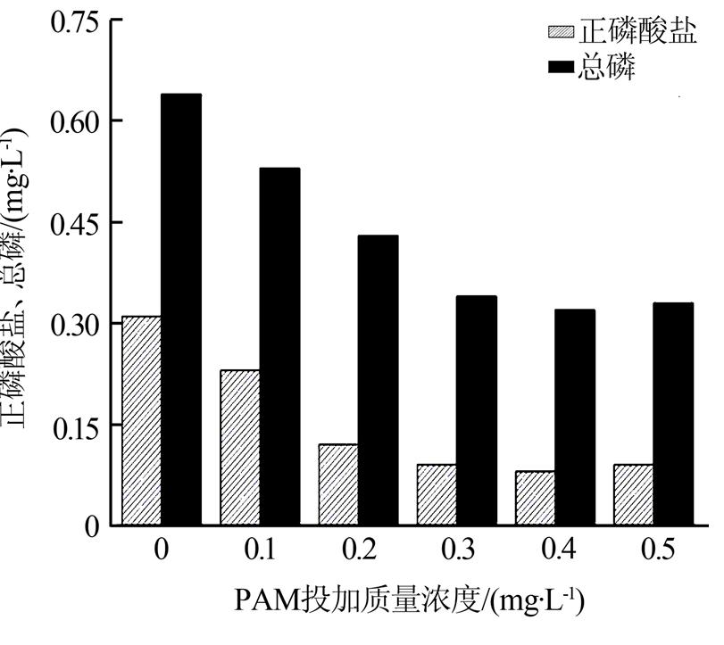 從圖 5可以看出,當(dāng)PAM投加質(zhì)量濃度為0.3 mg/L,經(jīng)沉淀后總磷質(zhì)量濃度可降低至0.4 mg/L以下,正磷酸鹽質(zhì)量濃度降低至0.1 mg/L以下。當(dāng)PAM投加質(zhì)量濃度大于0.3 mg/L,總磷和正磷酸鹽濃度變化趨勢不明顯。從實驗現(xiàn)象可以看出,與不加PAM相比,加入PAM后形成的絮體體積更大,沉淀時間減少。但是,過多加入PAM,不僅會增加廢水處理藥劑費用,同時還會增加水體COD〔11〕。因此,實驗確定PAM的比較佳投加質(zhì)量濃度為0.3 mg/L。