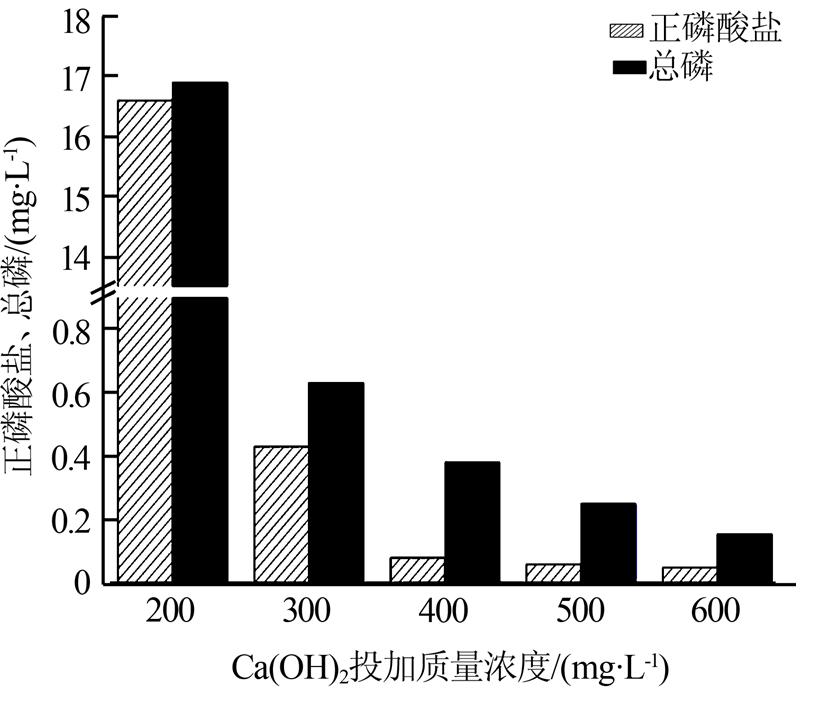 水質(zhì)同2.6,考察了不同Ca(OH)2投加量對氧化后廢水中磷去除率的影響。實驗所用水樣初始總磷質(zhì)量濃度為50.2 mg/L,正磷酸鹽質(zhì)量濃度為49.9 mg/L。Ca(OH)2的投加質(zhì)量濃度分別為200、300、400、500、600 mg/L,其對總磷和正磷酸鹽去除的實驗結(jié)果如圖 4所示。