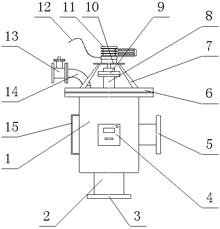 本實用新型的有益效果:本實用新型采用水處理罐體作為對水進行處理的主要部件,連接法蘭的設定在于能穩(wěn)定的將旋轉電機和彎管道固定在所需位置,并且有利于對水處理罐體進行維修,電機支撐架的設定也是為了使旋轉電機在工作時,避免出現左右搖晃的現象,增加了整個裝置的穩(wěn)定性;彎管道的設定有利于將處理后的雜物排出去,位置設定在連接法蘭上,使用起來很方便;出水管道與進水口的軸心線垂直,這種設計的好處在于連接外界的管道時很方便,并且有利于處理后的水流通;因此,本實用新型具有適用范圍廣、使用方便、穩(wěn)定性和水處理效果好的優(yōu)點。