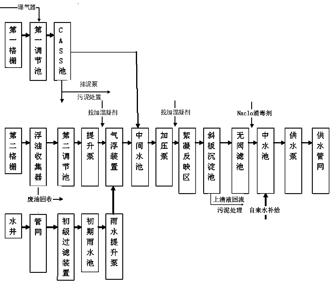 所述的綜合處理系統(tǒng)包括依次設(shè)置的中間水池、一體化凈水器以及中水池;所述的中間水池分別與CASS池以及氣浮裝置進行連接。