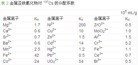金屬亞鐵氰化物對銫的選擇性吸附能力強 ,相關(guān)研究較多 。 Bing Li 等 〔19〕考察了亞鐵氰化鋅對低放廢水中 134Cs 的去除效果及相關(guān)影響因素。 研究結(jié)果表 明 ,pH 為 1 ~10、 134Cs 初 始 放 射 性 活 度 為 3.2 ~ 160.0 kBq/L 時,投加 0.33 g/L 亞鐵氰化鋅即可去除 98%以上的 134Cs,60 min 內(nèi)達到吸附平衡,吸附量為 9.6~463.0 kBq/g。 當 溫 度 為 0~50 ℃ 且Ca2+ 、Fe3+ 、 Mg2+、HCO3-、CO32-、Cl-、SO42- 存在時 ,亞鐵氰化鋅對 134Cs 的去除效果不受影響 ,但當溶液中含有 K+或 Na+時,134Cs 去除率降低 。 Changping Zhang 等 〔20〕用亞鐵氰化鉀鋅去除模擬廢水中的銫。 靜態(tài)試驗中 ,當亞鐵氰化鉀鋅投加量為 0.33 g/L,Cs+質(zhì)量 濃 度 為 100 μg/L 時 ,在 15 ℃下振蕩吸附 60 min 后 Cs+的去除率可達 98%以上,DF 為 76; 小試采用吸附-微濾工藝 ,持續(xù)曝氣使吸附劑與廢水充分混合,出水經(jīng)微濾膜過濾后用蠕動泵抽出 。 試驗處理水量 1320 L,濃縮產(chǎn)物體積為 2.28 L,出水中 Cs+的平均質(zhì)量濃度為 0.59 μg/L,平 均 DF 為 208,CF 為 539,具 有 毒 性 的 CN-質(zhì)量濃度 <2 μg/L。 V. V. Milyutin 等 〔21〕研究了不同 金 屬 的 亞 鐵 氰 化 物 共 沉 淀 微 量 銫 (105 Bq/L),當 Mn+與 Fe(CN)64-的物質(zhì)的量比為 1.33 時 ,金屬亞鐵氰化物對 137Cs 的分配系數(shù)見表 2。