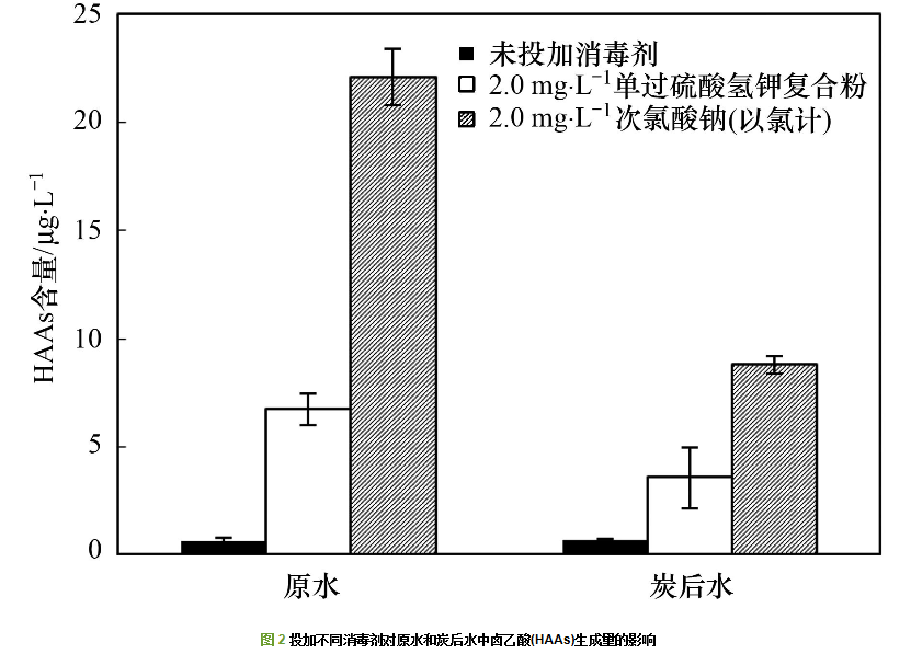 (2) 測試水樣經(jīng)氯消毒后的三鹵甲烷(THMs)和鹵乙酸(HAAs)生成量明顯高于經(jīng)單過硫酸氫鉀復(fù)合粉消毒后的生成量. 單過硫酸氫鉀復(fù)合粉消毒后雖然有DBPs生成,但其含量較低,并明顯低于氯消毒.