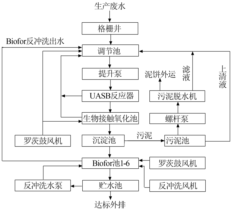 根據(jù)進(jìn)水水質(zhì)和水量情況,結(jié)合調(diào)研情況和實(shí)驗(yàn)室小試及中試結(jié)果進(jìn)行處理工藝的優(yōu)化組合,確定了“UASB—生物接觸氧化池—Biofor工藝的序批式運(yùn)行處理工藝,廢水處理站設(shè)計(jì)處理水量為600 m3/d,工藝流程如圖 1所示。