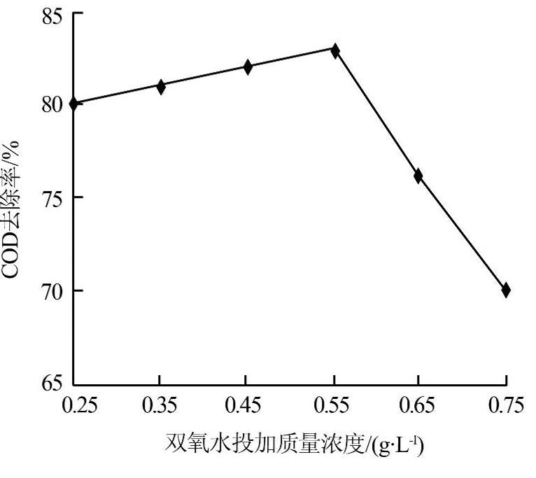 在pH=3.0,鐵炭總質(zhì)量濃度20 g/L,反應(yīng)時間40 min,MnO2投加質(zhì)量濃度為2.50 g/L,鐵炭比3∶1條件下,分別加入0.25、0.35、0.45、0.55、0.65、0.75 g/L H2O2進(jìn)行實(shí)驗(yàn),考察H2O2對微電解處理廢水體系的催化作用,結(jié)果如圖3所示。