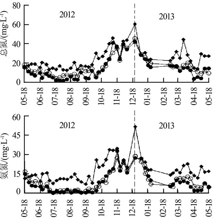 實驗從2012年5月18日至2013年5月18日為期1 a。為了研究植物和基質(zhì)級配對營養(yǎng)物去除效果的影響,在距離濕地進水口水平方向的1/4、2/4和3/4處分別采集深度為7.5、25、45 cm(各種級配基質(zhì)的中間層)的水樣。濕地進出水水樣每周取一次,DO采用HQ30d便攜式溶解氧測定儀(美國哈希公司)測定,TN、NH3-N、NO3--N、NO2--N、TP、PO43--P、COD、BOD5和SS按照《水和廢水監(jiān)測分析方法》〔8〕測定。濕地植物于2012年5月26日基本長出,于2012年10月5日收割,生長期為132 d。收割時保留植物根部及基質(zhì)以上10 cm的莖稈。植物樣品的氮磷含量采用H2SO4-H2O2消解法測定〔9〕。
