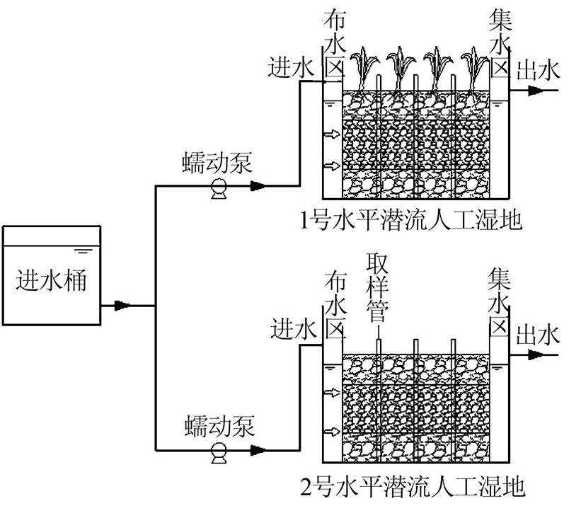 目前對濕地植物和基質(zhì)的研究多集中于植物和基質(zhì)種類的選擇,關(guān)于濕地中植物、基質(zhì)級配的共同作用對水平流人工濕地處理污染河水營養(yǎng)物的影響研究相對空白,而且大量研究結(jié)果表明構(gòu)建人工濕地時采用當?shù)匚锊氖禽^好的選擇。由于單一濕地無法同時提供好氧-厭氧的利于脫氮的環(huán)境,因此越來越多的研究采用復合濕地來實現(xiàn)對污水的有效處理,而且人工濕地對有機物的去除差異性較小。因此,筆者構(gòu)建了種植有蘆葦(Phragmites australis)和空白無植物的水平潛流人工濕地,研究作為表流-水平流復合濕地中二級潛流的水平潛流人工濕地植物和大孔隙率、多級配基質(zhì)對處理河流營養(yǎng)物的影響作用,并分析了植物在人工濕地中的直接和間接作用。
