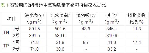 秋季對1號濕地中的植物進行收割,通過測量植物干重和植物內(nèi)的氮磷含量,得到實驗期間通過植物吸收所去除的營養(yǎng)物總量,并與2號濕地進行對比,結(jié)果如表 1所示。