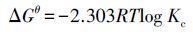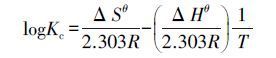 式(7)中,Kc為溫度T下的平衡常數(shù),可以通過Kc=qe/Ce計算,qe為平衡吸附容量,Ce為溶液中吸附質(zhì)的平衡濃度,ΔGθ、ΔHθ和ΔSθ分別為標(biāo)準(zhǔn)狀態(tài)下吸附反應(yīng)的吉布斯自由能變、焓變和熵變.公式(7)也可以表示為: