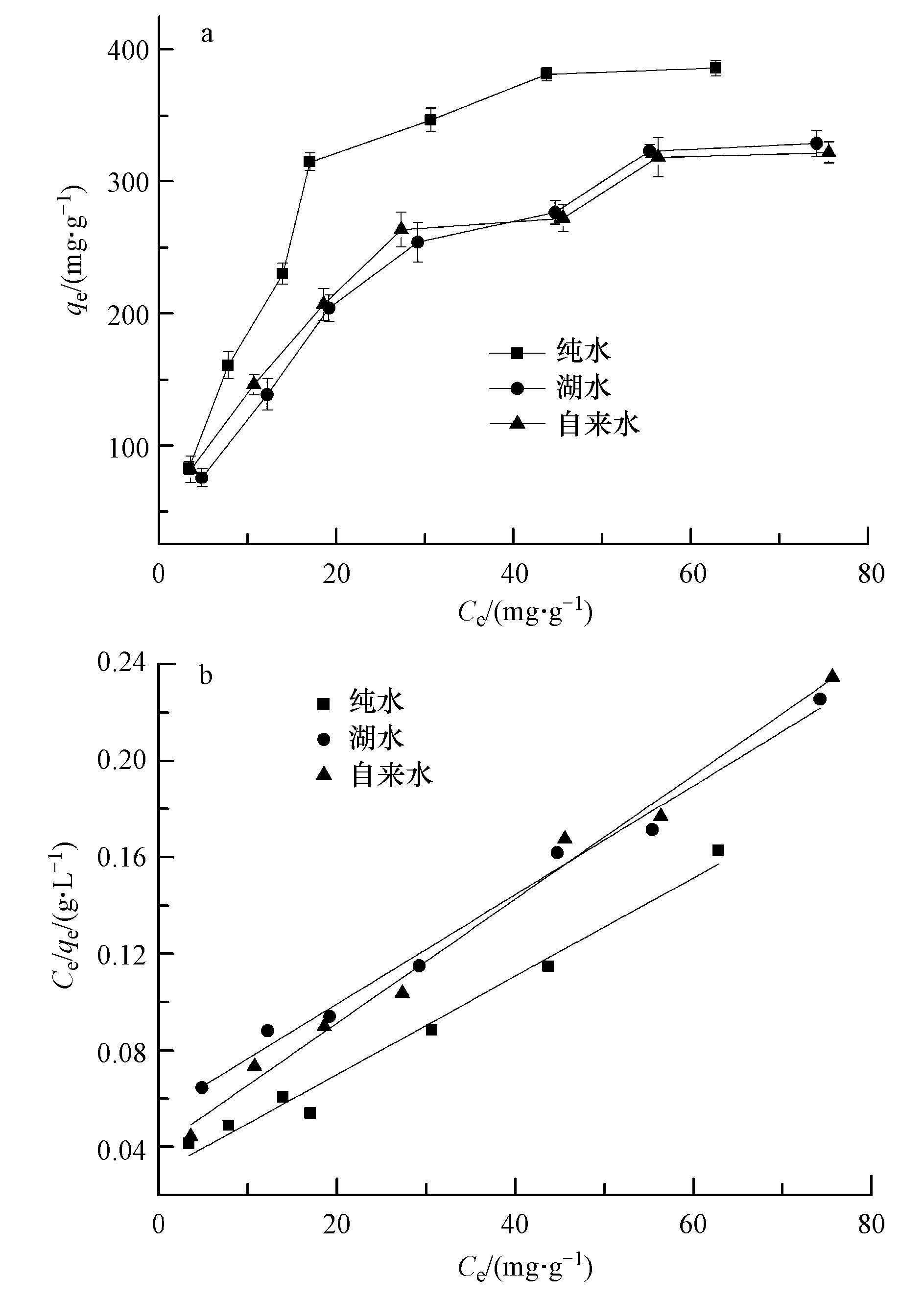 等溫吸附研究在30 ℃下進(jìn)行,甲基綠初始濃度設(shè)置為20、40、60、80、100、120、140 mg·L-1,為考察吸附劑對不同水樣中甲基綠的吸附效果,選擇純水、湖水和自來水作為介質(zhì),吸附數(shù)據(jù)如圖 7a.隨著各水樣中甲基綠濃度的上升,吸附容量在開始時急劇上升,隨后就趨于平緩,說明吸附達(dá)到了飽和.采用朗格繆爾和弗倫德里希兩種模型對吸附數(shù)據(jù)進(jìn)行擬合,兩種模型線性方程如(1)、(2)所示.