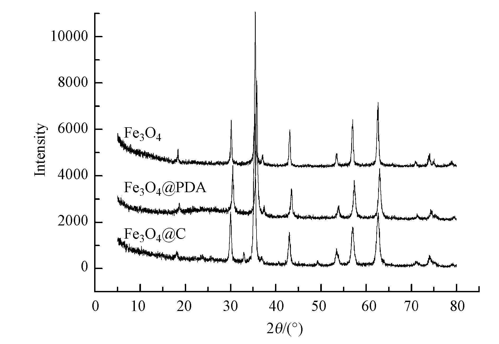 圖 3給出了Fe3O4、聚多巴胺包覆的Fe3O4@PDA、Fe3O4@C的X射線衍射圖.Fe3O4和Fe3O4@PDA衍射峰的位置完全一樣,在2θ為30.12°、35.38°、43.05°、53.39°、56.91°、62.54°處出現(xiàn)了較強(qiáng)的衍射峰,其分別對應(yīng)立方相Fe3O4的(220)、(311)、(400)、(422)、(511)、(440)晶面(張燚等,2011;危晶等,2012;黃保軍等,2012),經(jīng)過在高溫下炭化得到的Fe3O4@C除在以上位置有衍射峰外,在2θ為33.17°和49.33°處有較小的衍射峰,對應(yīng)著斜六方Fe2O3的(104)和(024)晶面,這說明在炭化的過程中部分Fe3O4相變?yōu)镕e2O3,與磁性測量的結(jié)果一致.