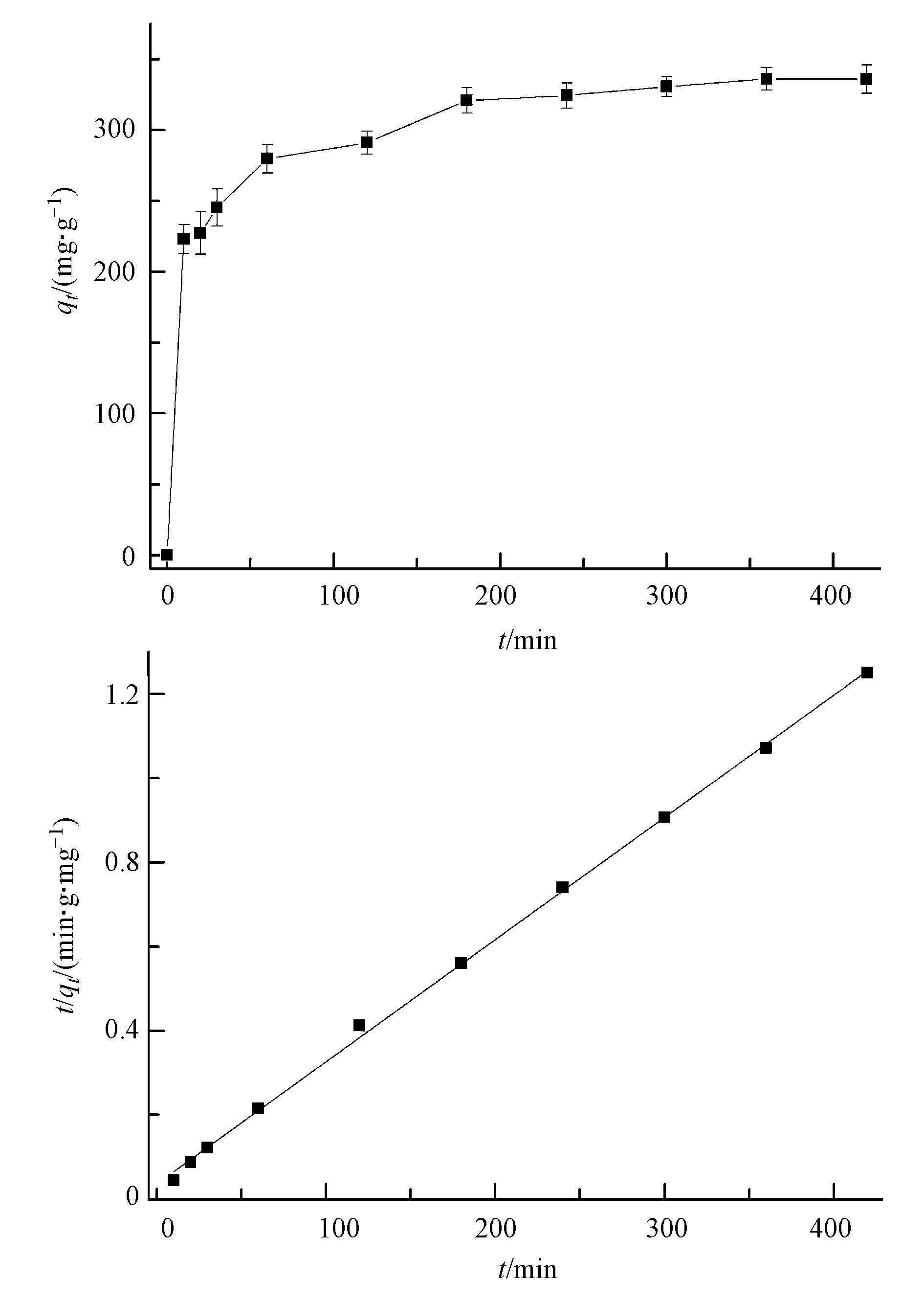 圖 8甲基綠在Fe3O4@C上(a)吸附量隨時間的變化及(b)擬二級動力學(xué)擬合曲線