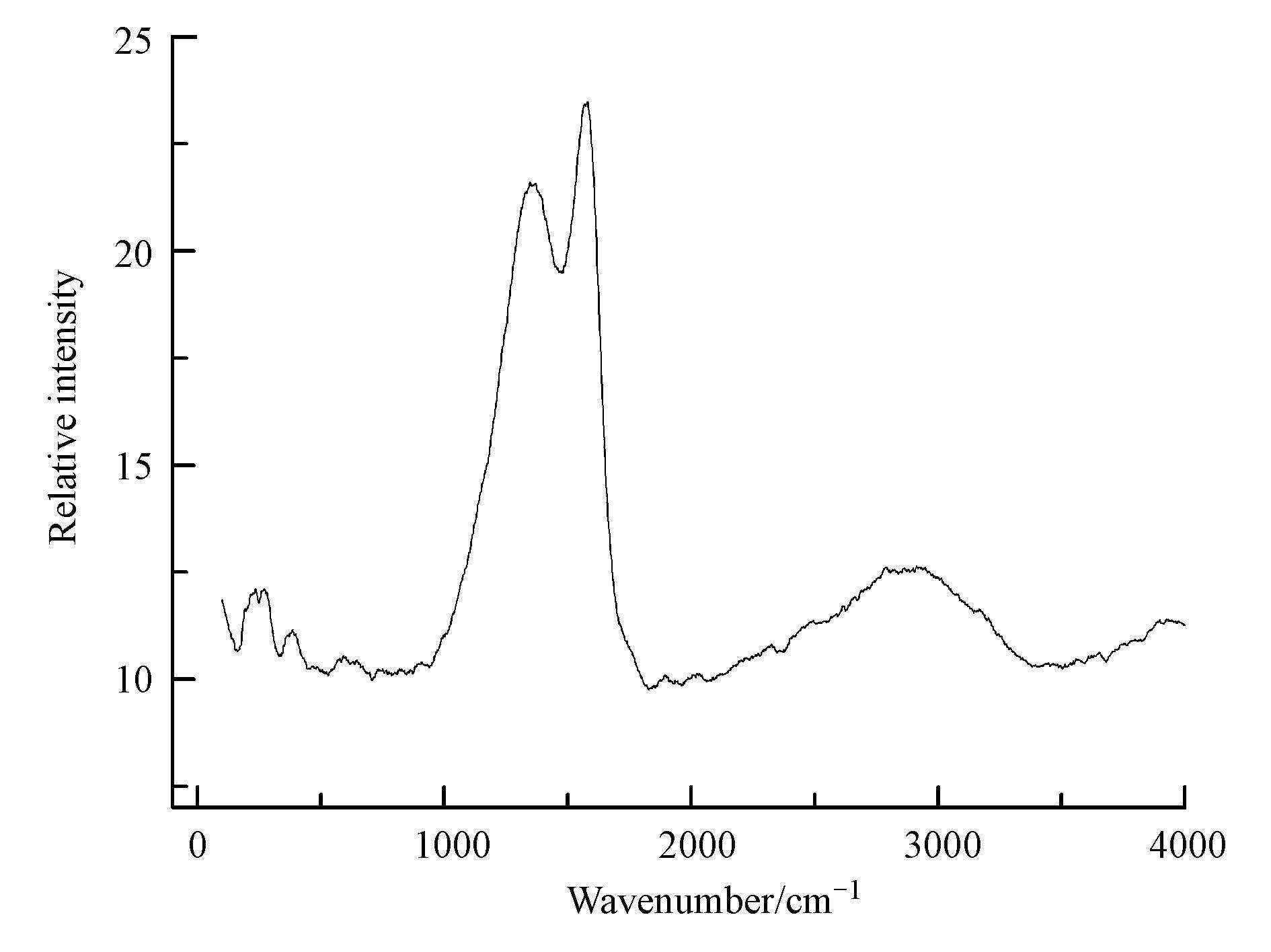 圖 5為Fe3O4@C的拉曼光譜圖,圖譜中出現(xiàn)在波數(shù)為1350 cm-1附近的峰稱為D峰,D峰反映炭原子晶體的缺陷程度,是石墨晶格缺陷、邊緣無序排列和低對稱碳結(jié)構(gòu)所引起的,代表炭材料中亂層結(jié)構(gòu),是無序碳對應(yīng)的特征峰,其強(qiáng)度表征材料中sp2碳組成的六角網(wǎng)平面以及非石墨化邊界數(shù)量,即無序化度,位于波數(shù)為1580 cm-1附近的峰為G峰,是由石墨晶體的面內(nèi)振動產(chǎn)生,和材料的石墨化程度有關(guān),是用來表征石墨的峰(王定美等,2013;周慧龍等,2014;李偉等,2014).D峰和G峰的出現(xiàn)表明炭材料成功的包覆到Fe3O4上,G峰強(qiáng)度強(qiáng)于D峰說明在高溫炭化的過程中部分炭材料被石墨化.