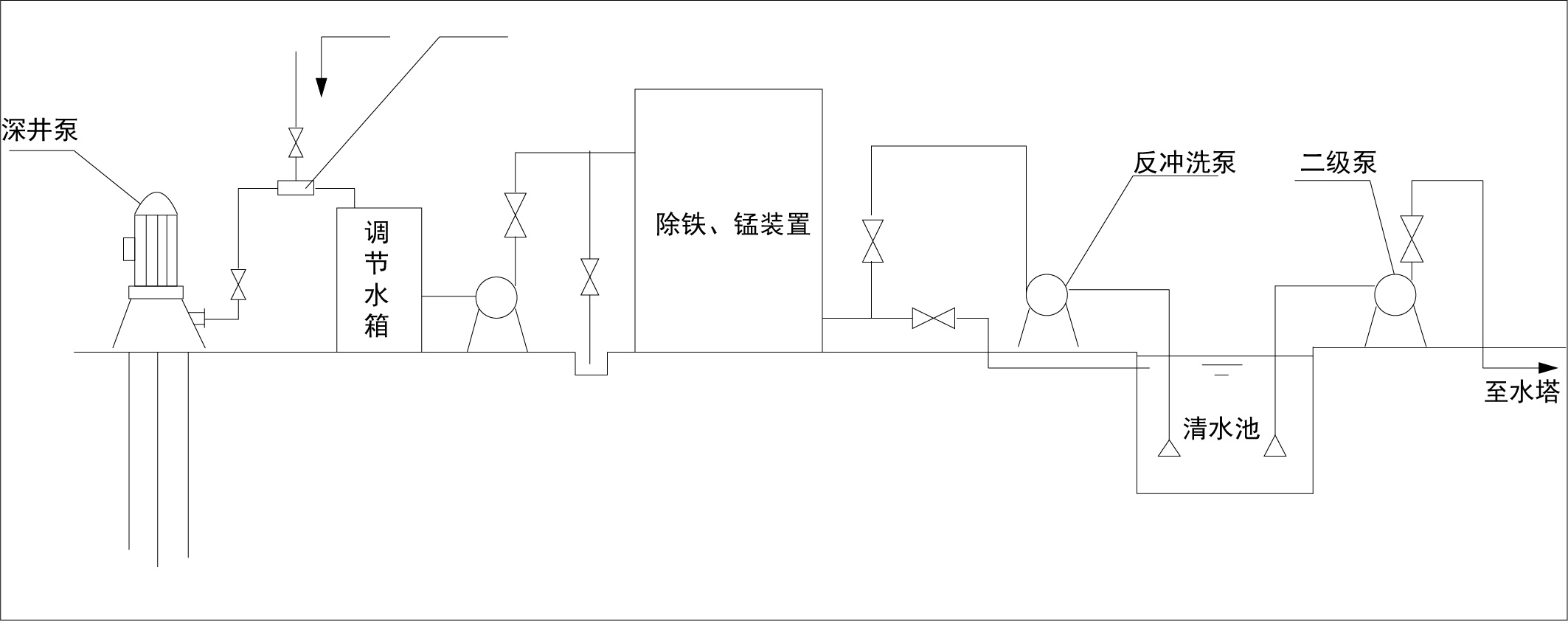 除鐵錳裝置由本體、引射曝氣裝置、中間加壓泵、反沖泵、控制系統(tǒng)、供水泵及管網(wǎng)系統(tǒng)組成。