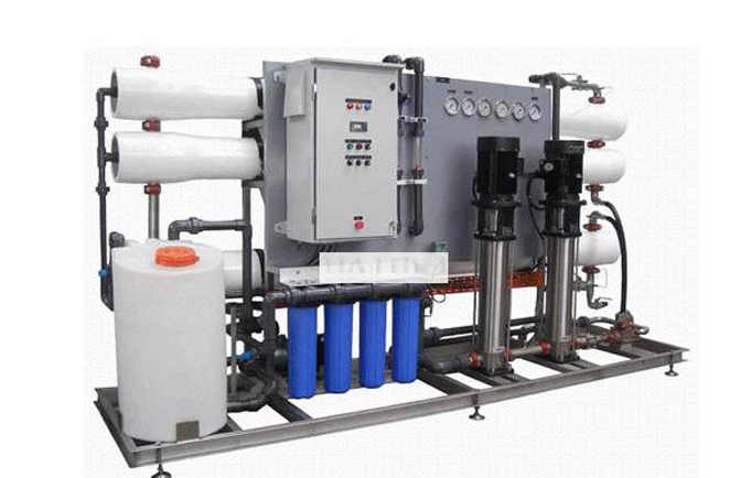 原水(設有壓力保護)→增壓泵(一用一備)→砂過濾器→炭過濾器→硬化器(根據(jù)地區(qū)不合選用)→緊密過濾器(或稱保安過濾器)→兩頭水箱→一級RO高壓泵→一級RO反滲透零碎→RO水箱→二級RO高壓泵→二級RO水箱→增壓泵→EDI(CEDI)電去離子水(指除去了呈離子方式雜質(zhì)后的純水)主機→去離子水(指除去了呈離子方式雜質(zhì)后的純水)箱→去離子水(指除去了呈離子方式雜質(zhì)后的純水)泵→拋光混床→終端緊密過濾→UV紫外線殺菌→設備用水(水質(zhì)可以達到18MΩ.cm以上即0.055 μs/ ㎝以下,25 ℃)