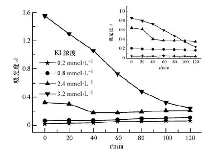 圖 10 不同KI添加濃度下反應(yīng)液的A460變化(插圖為對(duì)應(yīng)的A350變化)