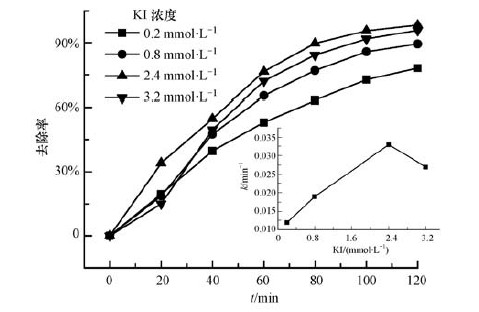 圖 9 KI添加濃度對(duì)UVA/H2O2/KI降解磺胺嘧啶的影響(插圖為不同KI添加濃度下準(zhǔn)一級(jí)反應(yīng)速率常數(shù))