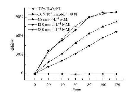 為探究UVA/H2O2/KI體系降解磺胺嘧啶的活性自由基類型,對(duì)初始濃度0.04 mmol·L-1的磺胺嘧啶溶液,在pH=3.2,H2O2、KI添加濃度分別為120.0、2.4 mmol·L-1條件下,考察了甲醇和甲硫咪唑(MMI)分別對(duì)磺胺嘧啶光降解的抑制情況,結(jié)果如圖 11所示. 由圖 11可見(jiàn),加入過(guò)量甲醇(HO·抑制劑)(Yeo et al.,2009)對(duì)UVA/H2O2/KI體系降解磺胺嘧啶幾乎沒(méi)有影響,說(shuō)明HO·非該體系的主要活性物質(zhì).甲硫咪唑作為HO·和碘自由基(I·、I2-·)的抑制劑(Taylor et al.,1984),對(duì)磺胺嘧啶的降解有明顯的抑制作用.當(dāng)甲硫咪唑添加量為4.8 mmol·L-1時(shí),120 min后磺胺嘧啶的去除率由98.2%降低至82.8%,這與H2O2/KI體系降解磺胺嘧啶的效果相當(dāng).增加甲硫咪唑添加量至12.0 mmol·L-1,去除率降低至66.7%,繼續(xù)增加其添加量至48.0 mmol·L-1,則完全抑制了UVA/H2O2/KI體系對(duì)磺胺嘧啶的降解. 因此,碘自由基(I·、I2-·)是UVA/H2O2/KI體系降解磺胺嘧啶的主要活性物質(zhì).