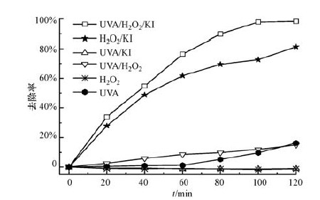 1)比較分析了單獨(dú)紫外輻射(UVA)、單獨(dú)H2O2氧化、UVA/H2O2、UVA/KI、H2O2/KI及UVA/H2O2/KI 6種不同反應(yīng)體系下磺胺嘧啶的降解效果,發(fā)現(xiàn)UVA/H2O2/KI能夠有效降解磺胺嘧啶,且磺胺嘧啶的去除與碘及其自由基有關(guān).