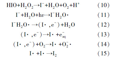 當(dāng)溶液初始pH值增加至6.2,體系中I2和I3-相對(duì)較少(圖 6),但磺胺嘧啶的去除率反而較高.這可能是由于偏中性條件下H2O2氧化性弱,會(huì)被中間氧化物HIO氧化(式(10))(Matsuzaki et al.,1972),故0 min時(shí),I2和I3-含量甚微,體系中以I-為主.I-在紫外光作用下通過(guò)電子轉(zhuǎn)移形成復(fù)合體I-H2O*,該復(fù)合體自身分離(式(11)~(12)),同時(shí)反應(yīng)(10)中產(chǎn)生的O2作為電子受體能夠極大地促進(jìn)復(fù)合體分離,促使I·、I2-·及O2-·等一系列自由基的產(chǎn)生(式(9),式(13)~式(14))(Yeo et al.,2009),故一定程度上增強(qiáng)磺胺嘧啶的去除效果,同時(shí)由于反應(yīng)(15)、(4)使得體系中I2和I3-逐漸增加.偏中性條件UAV/H2O2/KI體系對(duì)磺胺嘧啶的作用機(jī)理有待進(jìn)一步研究.本次研究結(jié)合磺胺嘧啶去除率及k值,將pH=3.2作為碘增強(qiáng)磺胺嘧啶紫外光降解的比較佳值.