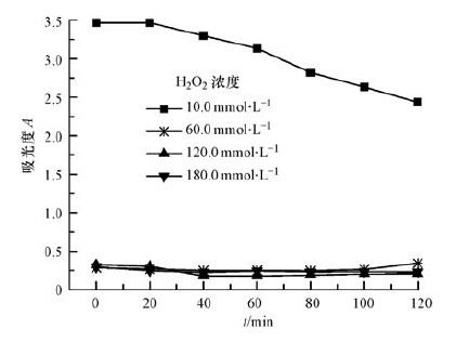 圖 8 不同H2O2添加濃度下反應(yīng)液的A350變化