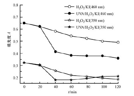 圖 4 UVA/H2O2/KI、H2O2/KI體系中反應(yīng)液的A460 、A350變化