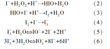 圖 8為不同H2O2添加濃度下反應(yīng)液的A350(即I3-)變化,H2O2添加濃度為10 mmol·L-1時(shí),體系中產(chǎn)生大量I3-,這是因?yàn)镠2O2添加濃度過(guò)低,氧化產(chǎn)生的有限I2會(huì)與大量剩余I-結(jié)合(式(4)),從而降低了I·的產(chǎn)生量,限制了磺胺嘧啶的降解(Hu et al.,2012;Yeo et al.,2009).增加H2O2添加濃度(10.0~120.0 mmol·L-1),體系中I2的產(chǎn)生量及碘自由基隨之增加,磺胺嘧啶的去除率明顯提高. 而繼續(xù)增加其添加濃度至180.0 mmol·L-1,由于中間氧化物HIO與過(guò)量H2O2反應(yīng)(式(10)),使得體系中I3-產(chǎn)生量相對(duì)提高(Katsuzaki et al.,1972),因而一定程度上限制了磺胺嘧啶的降解.具體參見(jiàn)污水寶商城資料或http://www.dowater.com更多相關(guān)技術(shù)文檔。