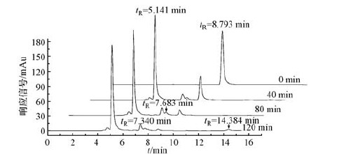 為研究UVA/H2O2/KI體系對(duì)磺胺嘧啶的降解情況,考察初始濃度為0.04 mmol·L-1的磺胺嘧啶溶液,在pH=3.2,H2O2、KI添加濃度分別為120.0、2.4 mmol·L-1條件下,UVA紫外輻射下磺胺嘧啶的HPLC譜圖變化,結(jié)果如圖 12所示.由圖 12可以看出,實(shí)驗(yàn)條件下,磺胺嘧啶的保留時(shí)間tR=8.793 min,隨著反應(yīng)的進(jìn)行,其峰面積不斷減小,說(shuō)明磺胺嘧啶得到了有效降解.體系中由于H2O2的加入,保留時(shí)間tR=5.141 min的物質(zhì)產(chǎn)生,且在反應(yīng)過(guò)程中其峰值幾乎保持不變.磺胺嘧啶降解過(guò)程中主要產(chǎn)生了3種中間產(chǎn)物,對(duì)應(yīng)保留時(shí)間依次為7.340、7.683和14.384 min. 在此色譜條件下,磺胺標(biāo)準(zhǔn)樣品的保留時(shí)間tR=7.447 min,與7.340 min非常接近,因此,推斷磺胺為UVA/H2O2/KI體系降解磺胺嘧啶的產(chǎn)物之一,具體磺胺嘧啶的降解路徑有待進(jìn)一步研究.