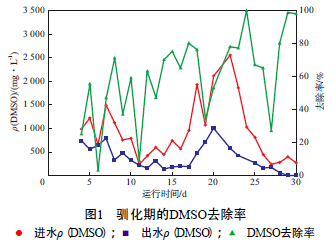 馴化期的DMSO去除率見圖1。由圖1可見:隨馴化時間的延長,DMSO的去除率總體呈上升趨勢;馴化第29天,DMSO去除率達98.5%,表明裝置運行29 d時MBR內(nèi)的污泥已馴化成功。