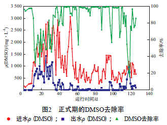 在正式期的第11天~第54天,持續(xù)的進水DMSO高負荷對模試裝置的運行形成沖擊,當DMSO處于高負荷狀態(tài)時DMSO的去除效果見表3。