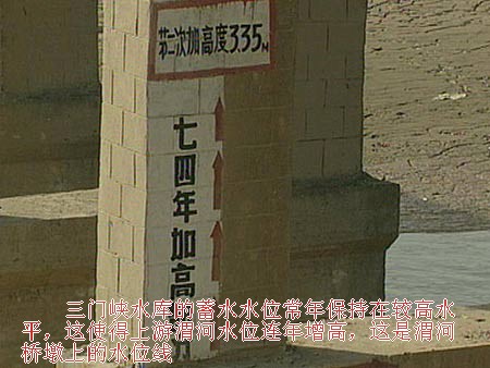 在渭河上的這個(gè)橋墩,記者看到,在1969年,該橋加高了3.05米,1974年,該橋又加高了3.35米。而對于生活在渭河附近的居民來說,渭河的升高,他們體會的更深。陜西省華縣下廟鎮(zhèn)農(nóng)民徒拴牢說:“那時(shí)(過去)河就是,我跟你說,河淺淺的。河梁(河岸)就是這么高一點(diǎn),看看有兩、三尺高。現(xiàn)在河底子都比那高,比河梁(河岸)都高。”