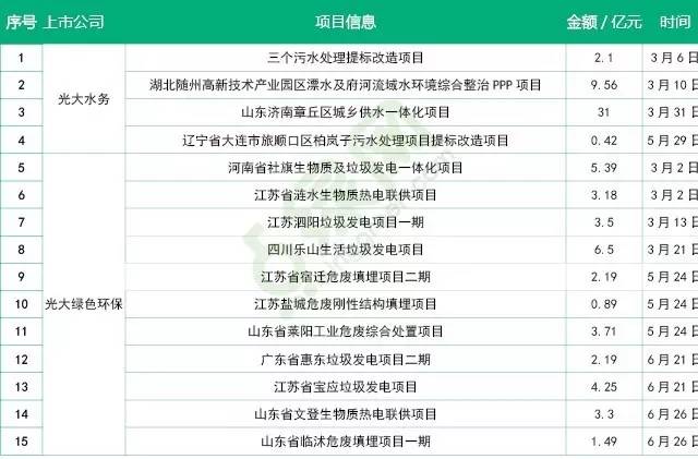 今年上市的光大綠色環(huán)保營收、毛利、盈利等整體增長近60%,新中標11個項目,而去年就上市的光大水務(wù)增長率約20~30%左右,新增的項目才6個。這其中的差別可能與國家政策利好的方向以及兩家子公司的業(yè)務(wù)方式有關(guān)。