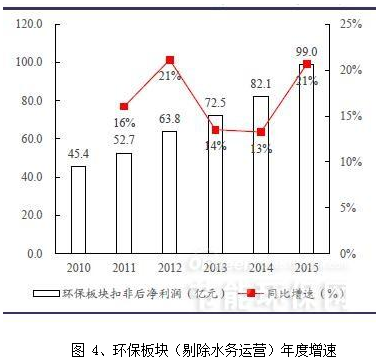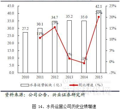 水務(wù)運(yùn)營板塊13、14、15 年扣非業(yè)績同比增長1%、-1%、20%(個(gè)股中山公用投資收益問題致行業(yè)增速偏高,若剔除此影響,15 年扣非增速0.2%)。水務(wù)運(yùn)營公用事業(yè)屬性明顯,水處理工程業(yè)績彈性明顯大于水務(wù)運(yùn)營。